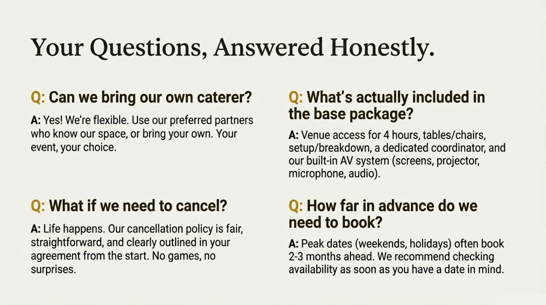 Create moments of joy, connection, and grace — not stress, surprise fees, or underwhelming experiences.